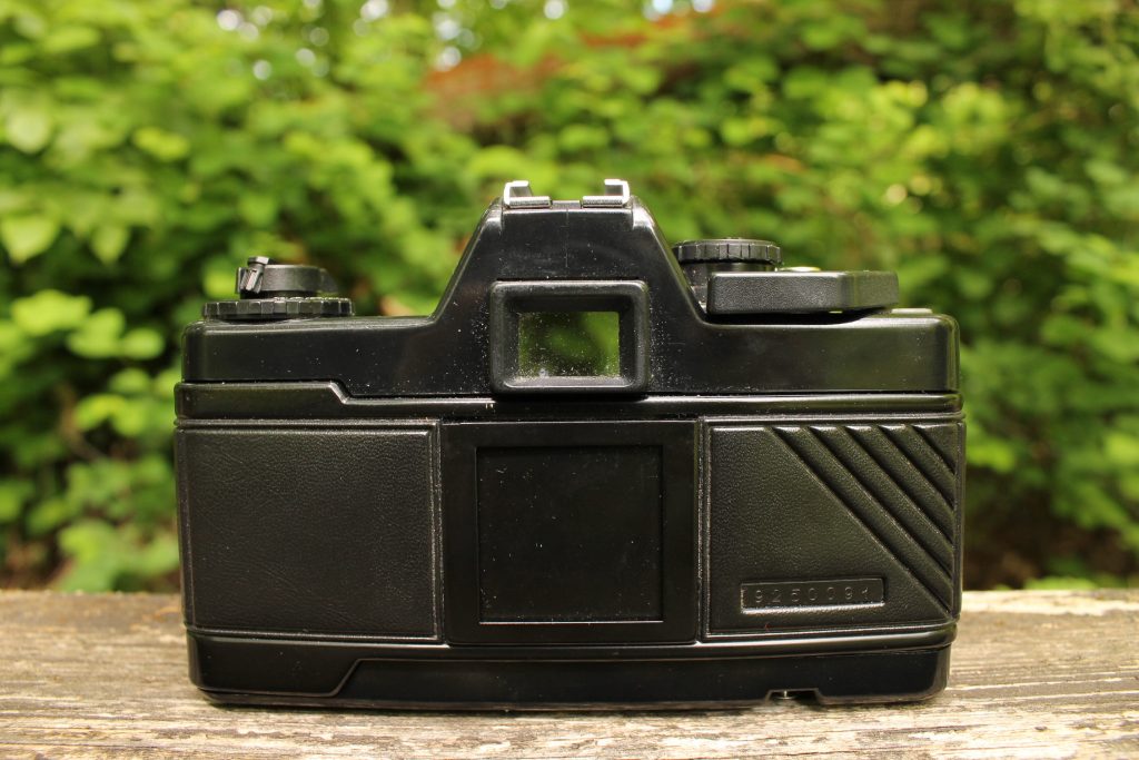 Aufbau von hinten: Auf der Rückseite gibt es für euch nur den Sucher und ein schwarzes Quadrat. Hier könnt ihr von oben ein Stück der Packung eures genutzten Analogfilms reinstecken. Andere Kameras wie die Exa-Kameras haben so etwas nicht. Dafür besitzen sie Filmmerkscheiben.