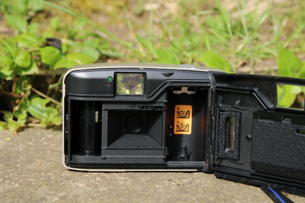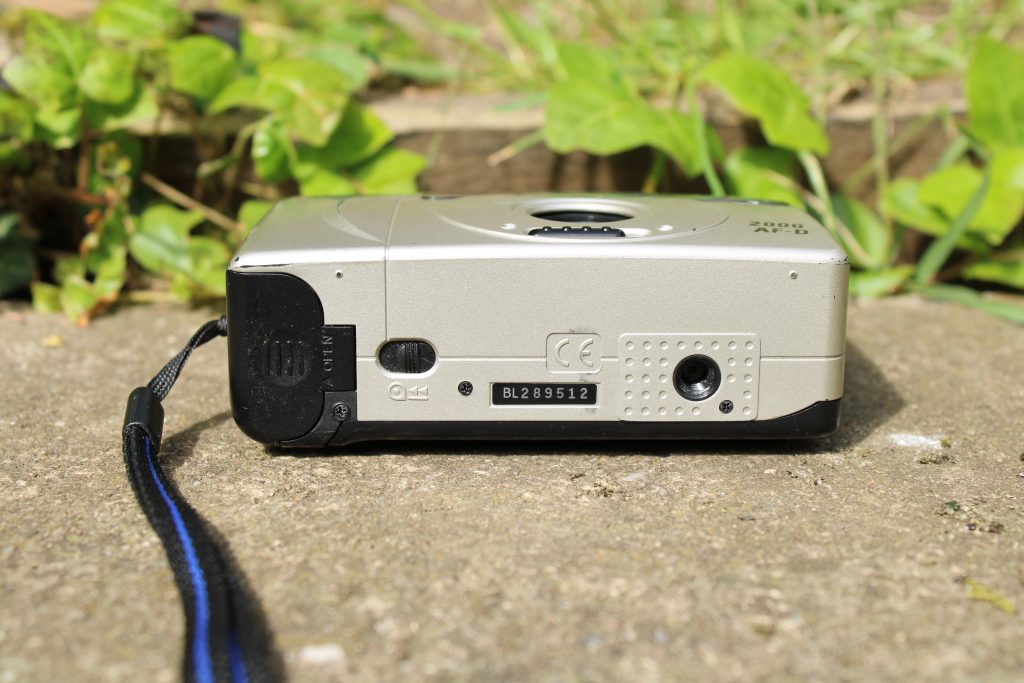 Aufbau von unten: Links auf der Unterseite liegt das Batteriefach. Hier sind zwei AA-Batterien notwendig. Rechs daneben ist die Rückspultaste. Bei dieser Kamera läuft das Zurückspulen rein elektronisch ab. Bei anderen Kameras ist es möglich, den Analogfilm per Hand zurückzuspulen. Zum Schluss bleibt noch rechts die Stativmutter, wo die Kamera am Stativ befestigt wird.
